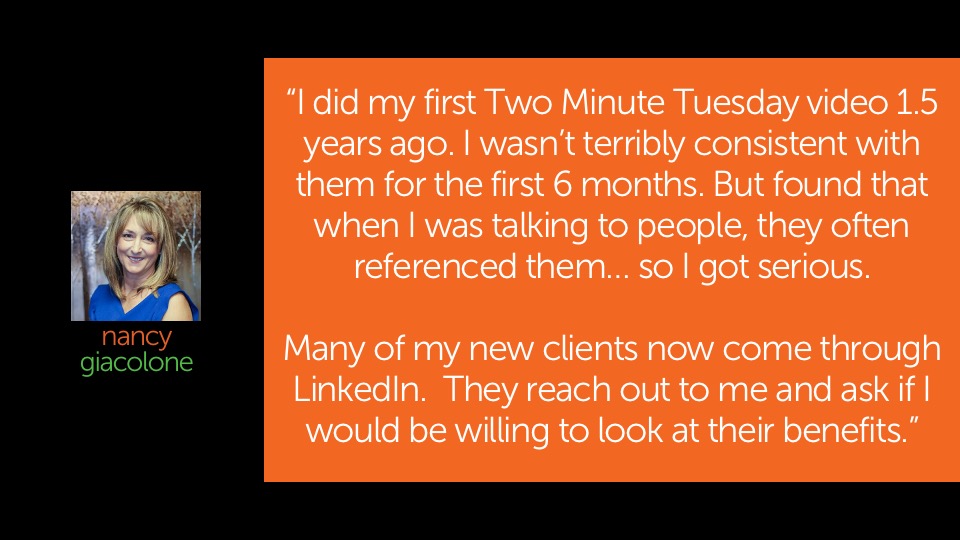 Nancy Giacolone started dabbling with LinkedIn posts, and she stretched herself to share a weekly video she calls “Two Minute Tuesday.” She finds something in the news, from a carrier, or from a client in the week leading up to it that she can speak to. Once you start looking, she says, “Life is full of content!” Today, she’s earned a number of clients who first learned about her online.