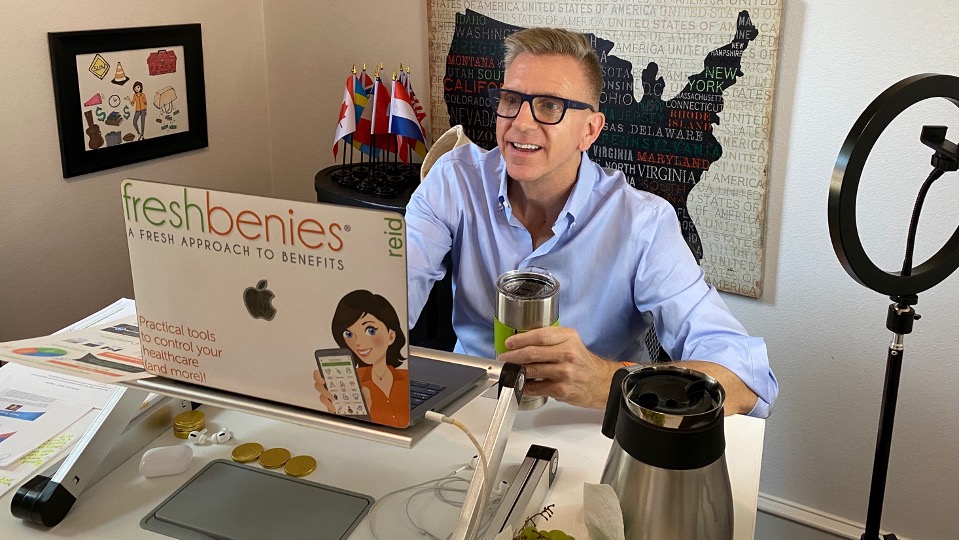 The other side of preparation is preparing “the room.” You’re working from home, and maybe you need to also work around a spouse, kids, and even pets. But it doesn’t mean you don’t have options. Here’s a picture of me last month presenting NAHU’s 3-hour Single Payer Certification class. Notice the lighting, computer stand, background props (flags, money bag, chocolate coins), and of course a full pot of coffee.