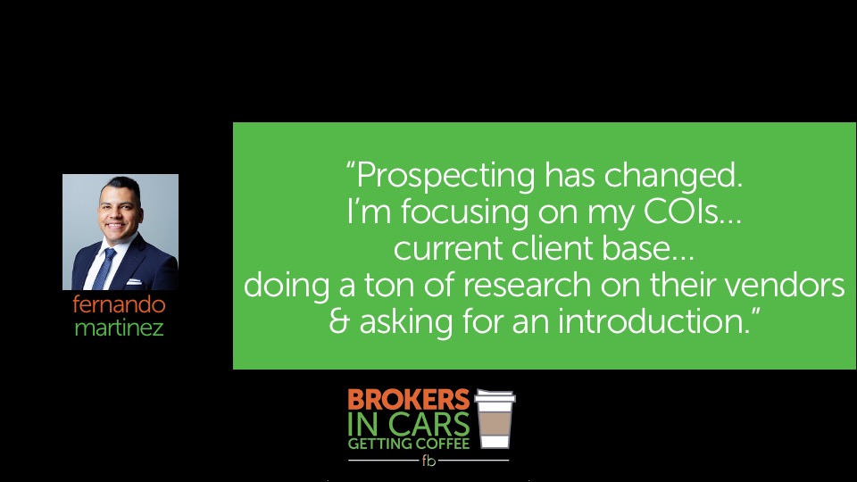 In today’s environment, employers are scrambling for great advice. And while they’re not answering your cold call, they will usually respond to a well-timed warm introduction from someone they trust. Fernando Martinez has shifted his cold-calling routine and is seeing solid results. Click here to hear him share his experience in our “Brokers in Cars Getting Coffee” interview (4:07 minute mark).