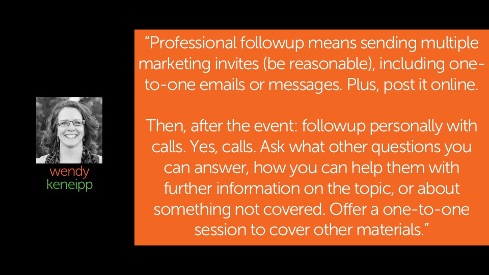 We say it twice because it’s true – and it’s THAT important. Heidi Rasmussen advises, “Your goal is to get prospects into your ‘web’ and then CONSISTENTLY serve up GREAT content they care about, in CONSISTENT channels, with CONSISTENT messaging and branding.”