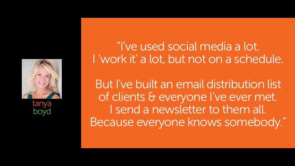 It’s far better to commit to a couple channels and to do it great, than it is to dabble with half a dozen. Over the past 6+ years, Tanya Boyd made a strong commitment to build her email distribution list that is now thousands strong and her strongest marketing channel.