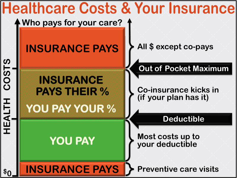 This is the most you’ll pay toward your healthcare in a given year. If I have an insurance plan with an out-of-pocket maximum of $5,000, once I’ve reached that amount, the insurance company picks up 100% of the costs for the rest of the plan year (excluding co-pays).