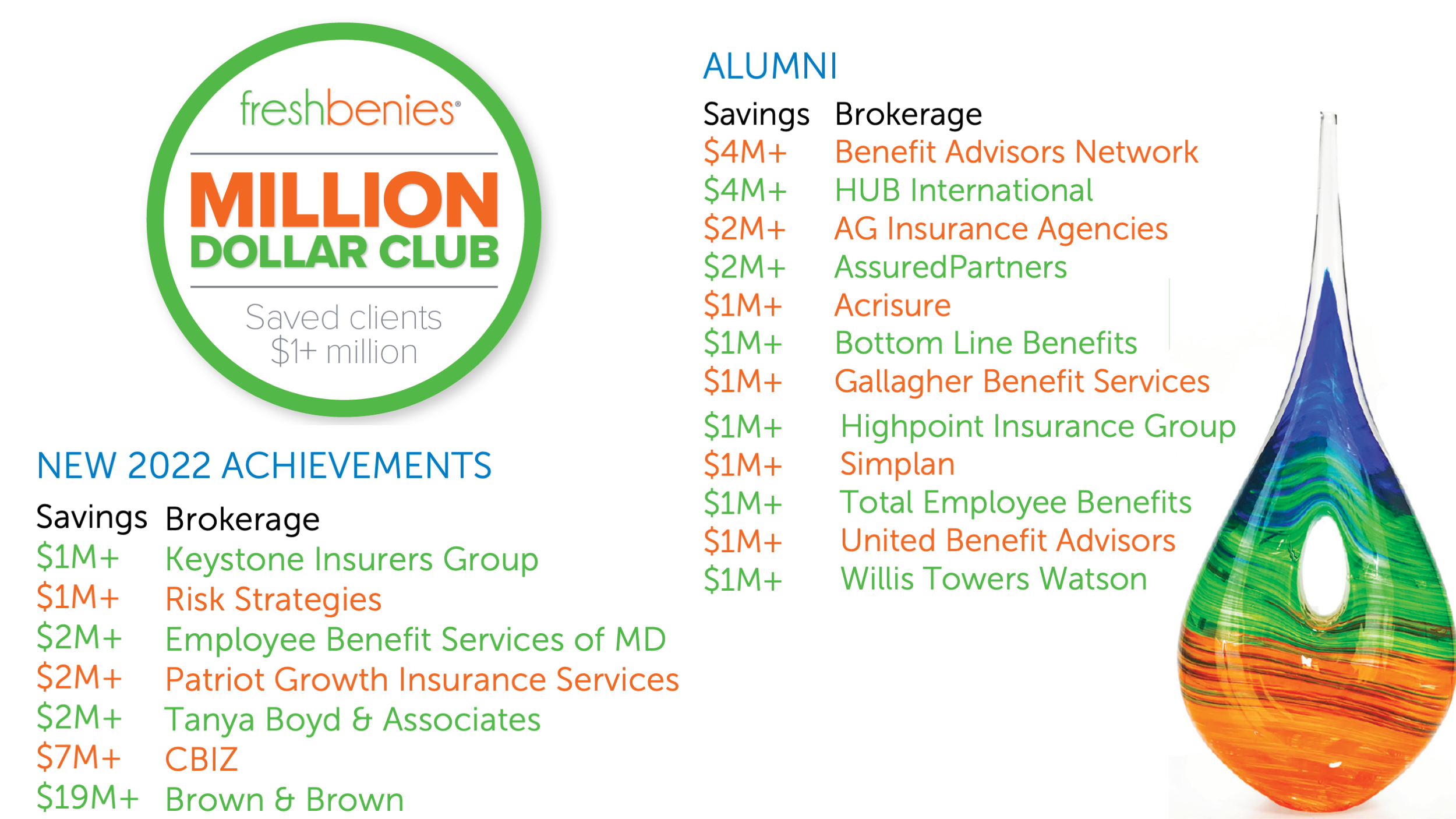 To date, freshbenies has helped clients save over $100M in unnecessary claims. Check out the below list of Million Dollar Club brokerages - partners who've saved their clients $1 million or more in unnecessary healthcare costs with freshbenies.