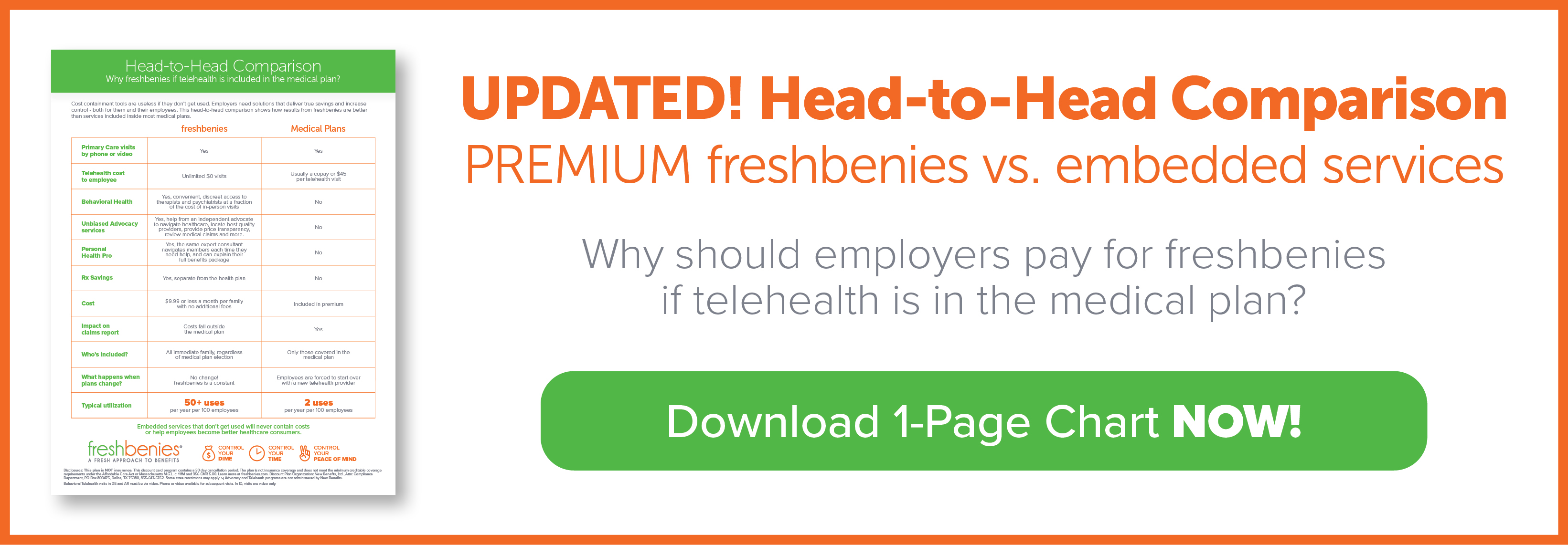 Just as employees are getting used to using it, most plans are reverting to co-pays. freshbenies is the best place for Telehealth: $0 visit fee, agnostic to the ever-changing carrier plans, and an engagement system that drives high usage. And our newest packages include much-needed Behavioral Telehealth.