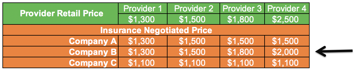 Problem #2: Using the example above, if I had a $5,000 deductible plan with Insurance Company B and I needed a Browoscopy, I would be very smart to shop around and go to Provider 1. I could save up to $700. If I didn’t shop around, I would be fine spending $2,000 at Provider 4 and think I got a deal through my insurance company’s negotiated rate (because I got a $500 discount).