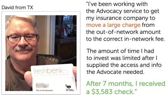 A strong Advocacy service can be a big help. Advocacy companies offer experts who are trained in the healthcare industry to personally guide people and help them navigate “the system.” See below for two real-life examples. In addition to price transparency, an Advocate can review and negotiate medical bills, locate in-network providers, review prescriptions for lower-cost options, and provide guidance to understand and use their benefits more efficiently.